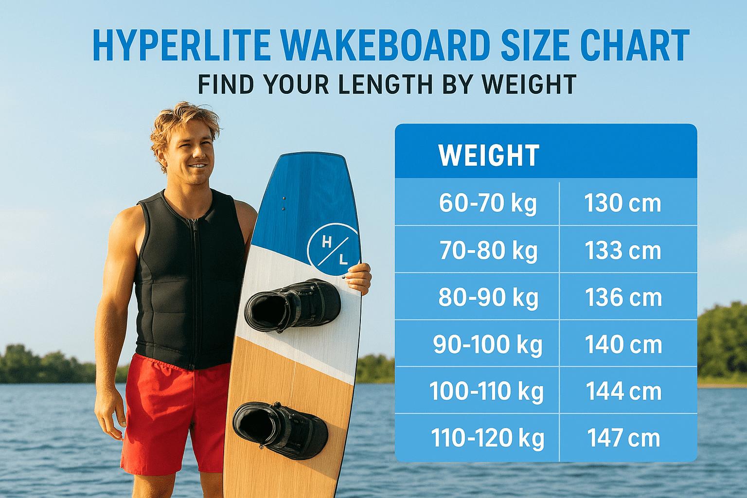The Hyperlite wakeboard size chart below gives you a direct weight-to-length reference for their current adult lineup. Pull up your weight, find the matching range, and you have a reliable starting length before you factor in anything else.